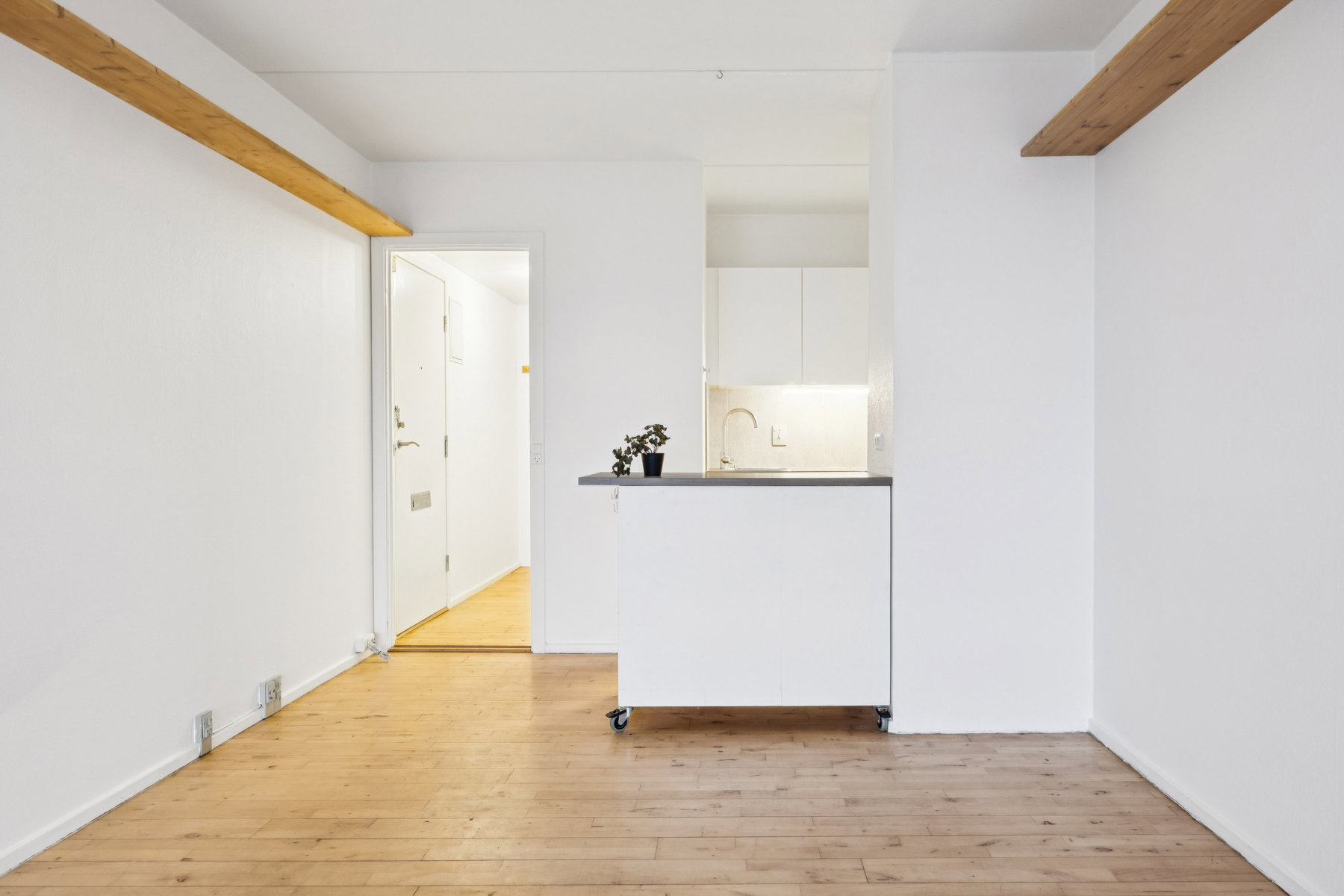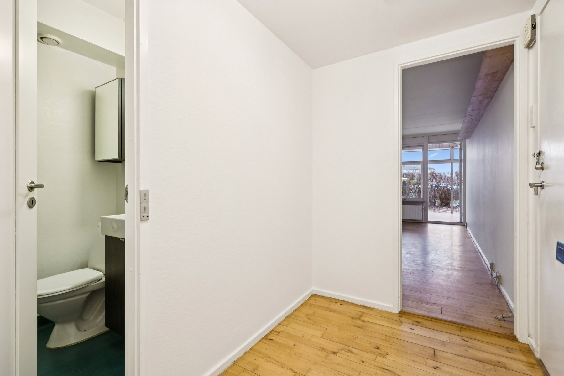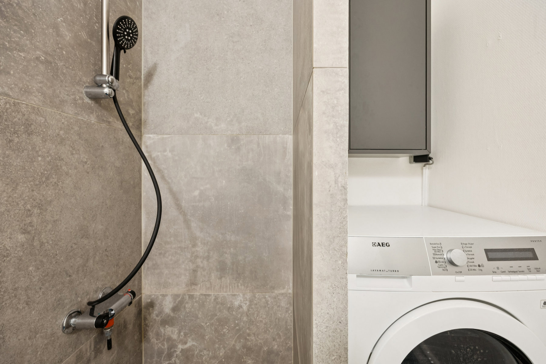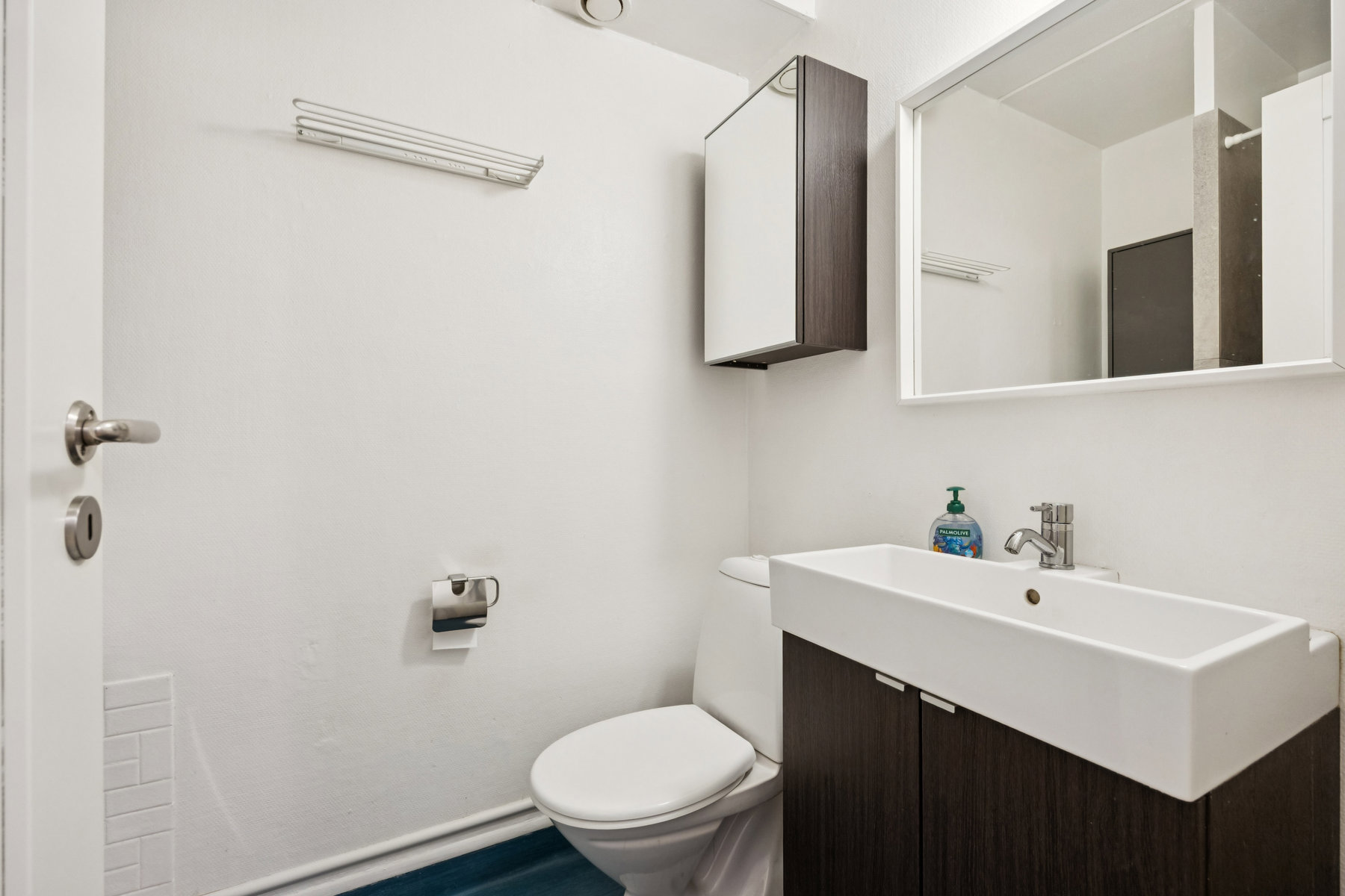 Lejligheden rummer 36 velindrettede m² og byder dig velkommen i en rummelig entré med garderobeskab og god opbevaringsplads. Herfra er der adgang til et flot badeværelse med muret brusekabine i elegante sandfarvede fliser, kombineret vaske-/tørremaskine, toilet samt skabsarrangement med håndvask og ekstra vægskabe.