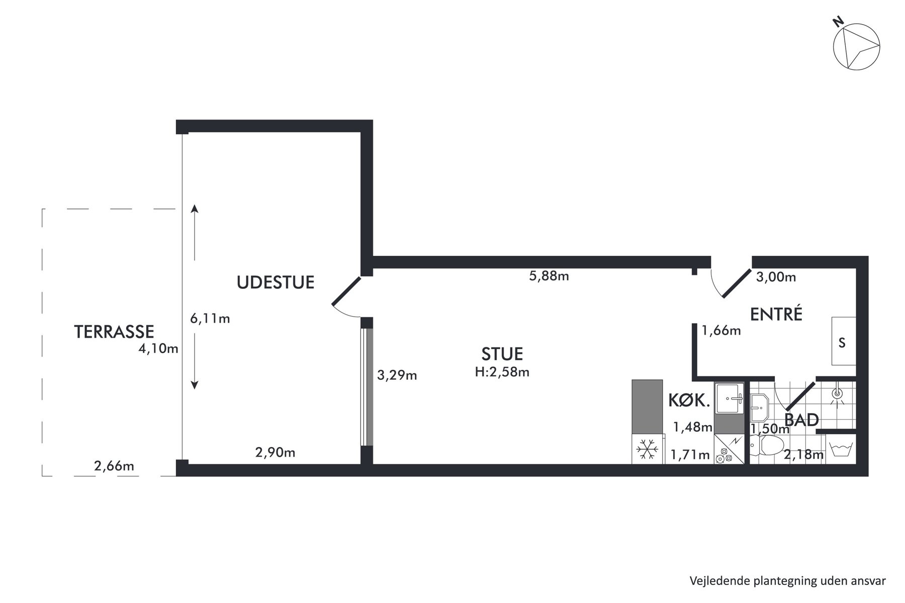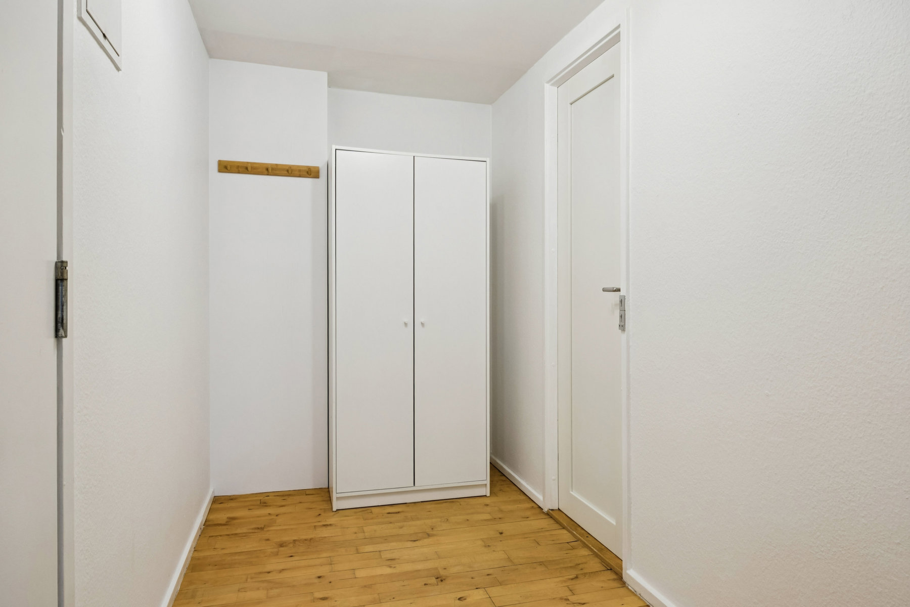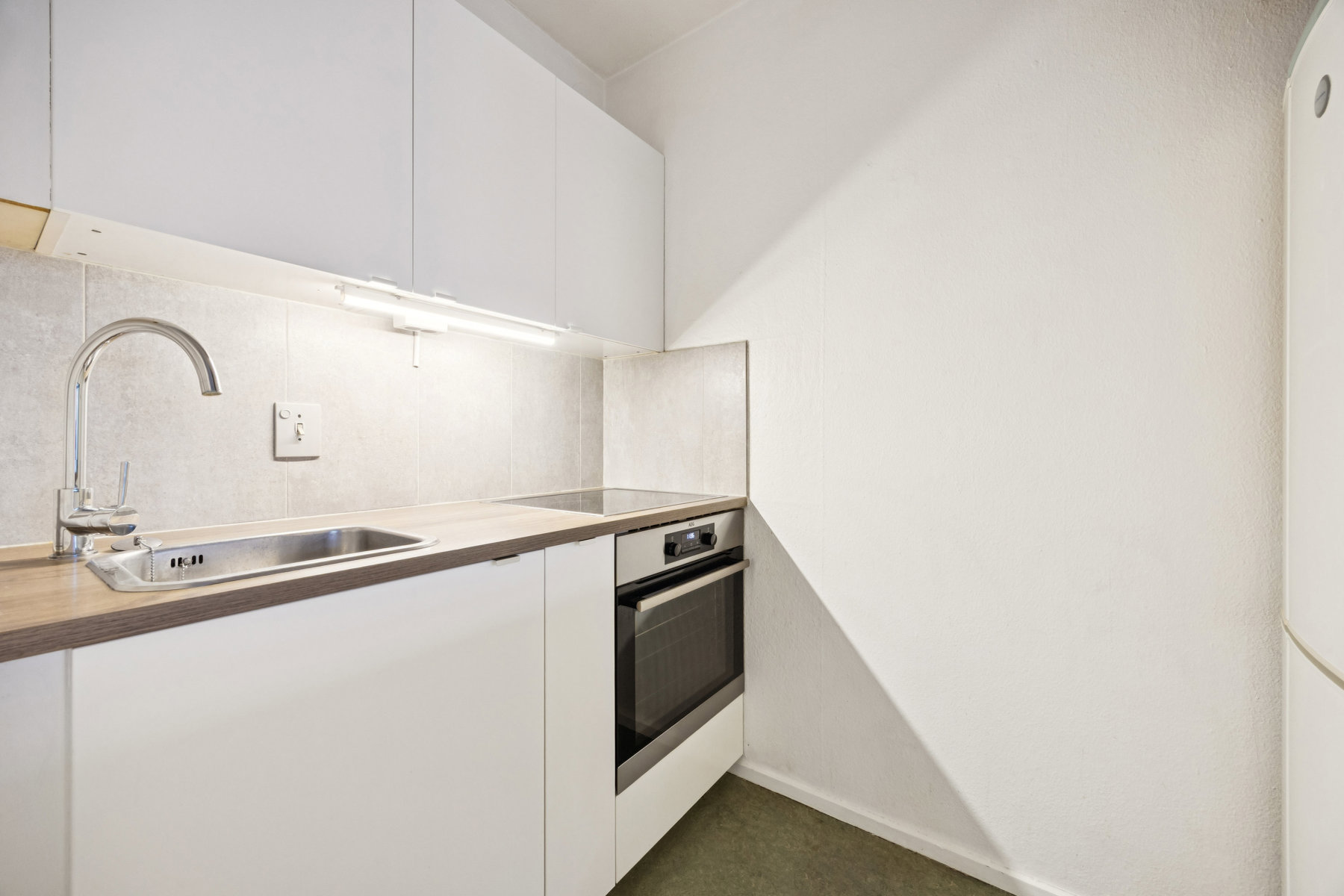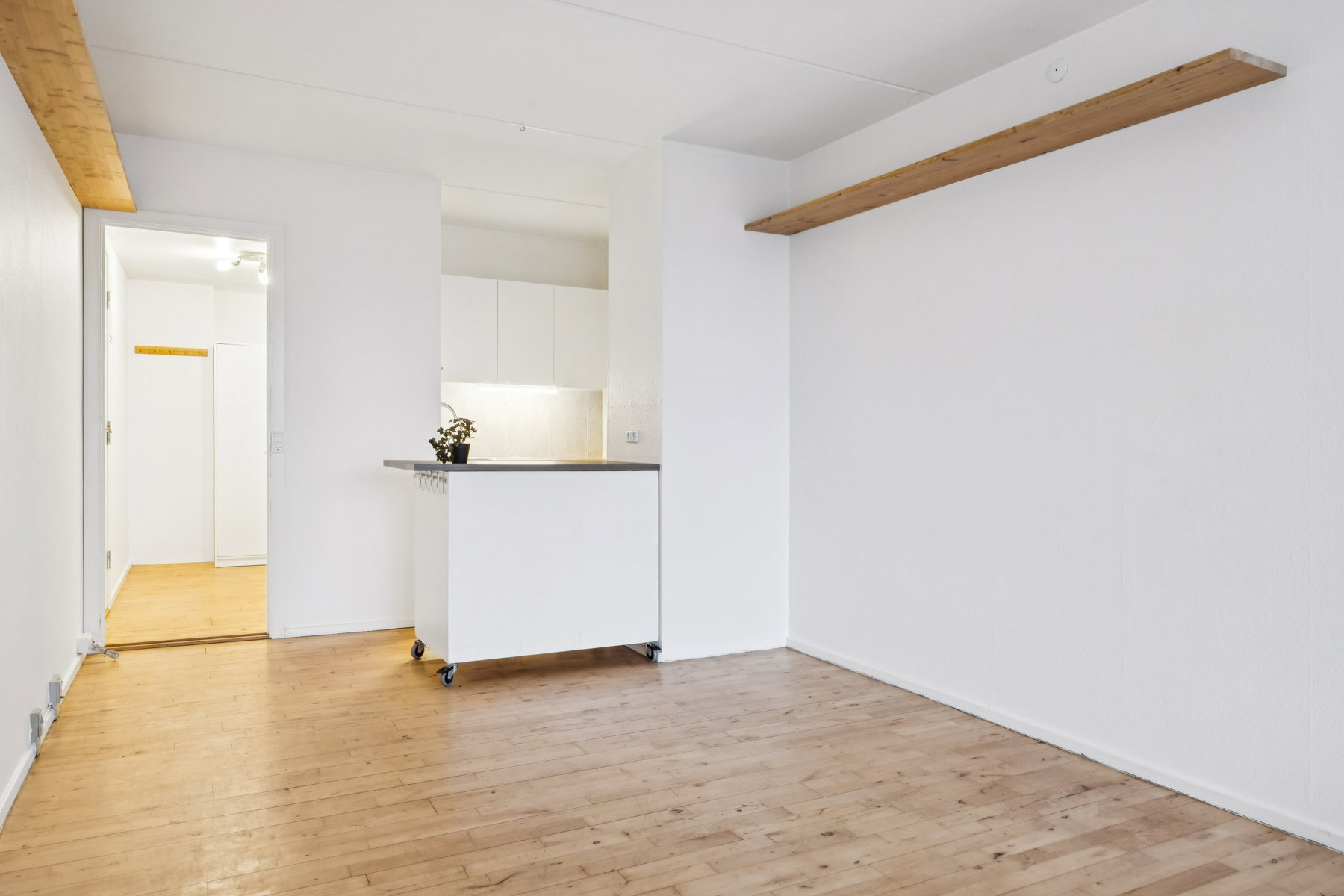 Lejligheden rummer 36 velindrettede m² og byder dig velkommen i en rummelig entré med garderobeskab og god opbevaringsplads. Herfra er der adgang til et flot badeværelse med muret brusekabine i elegante sandfarvede fliser, kombineret vaske-/tørremaskine, toilet samt skabsarrangement med håndvask og ekstra vægskabe.