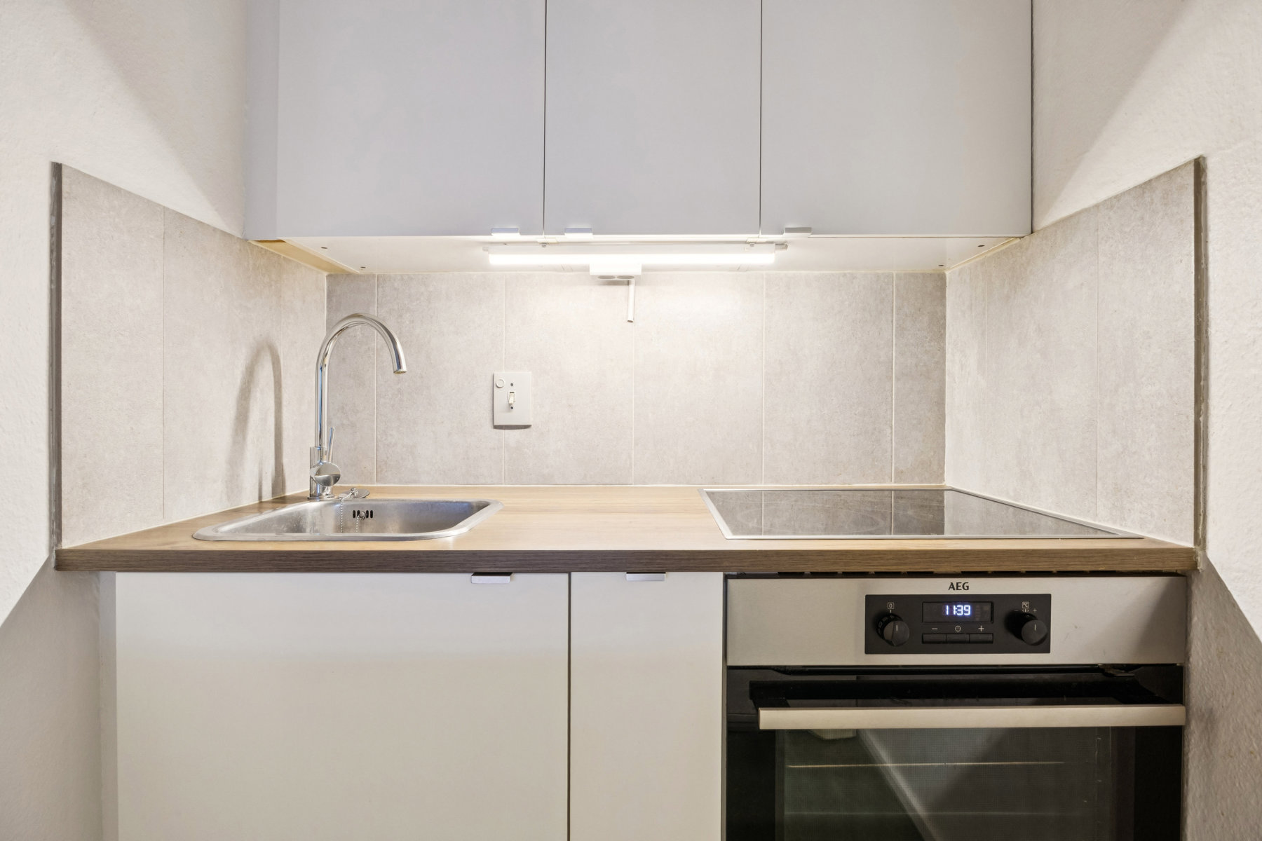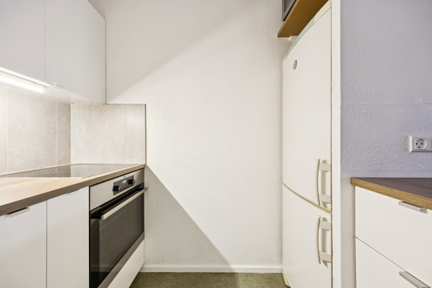 Boligens naturlige samlingspunkt er den lyse stue med køkken i åben forbindelse. Køkkenet fremstår moderne i hvidt med sandfarvede fliser, og er udstyret med glaskeramisk kogeplade, ovn, mikroovn, køle-/fryseskab samt en praktisk, mobil køkkenø, der giver fleksibilitet i indretningen.